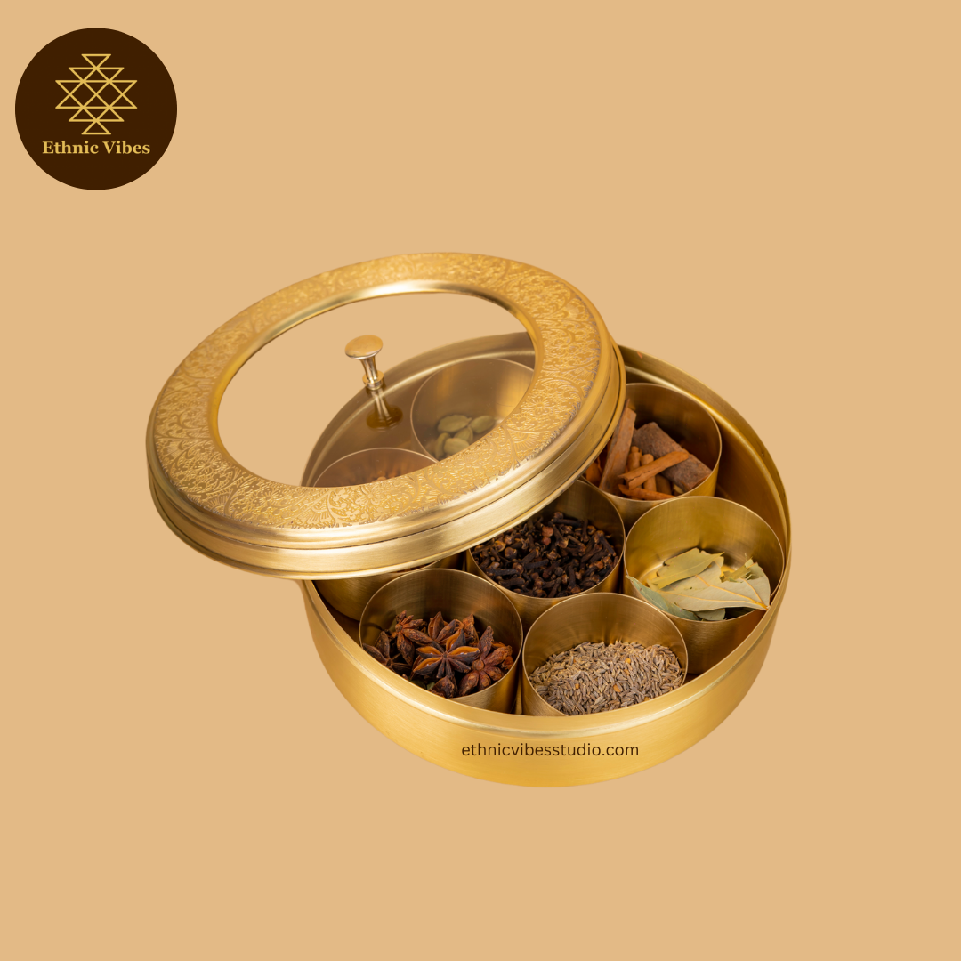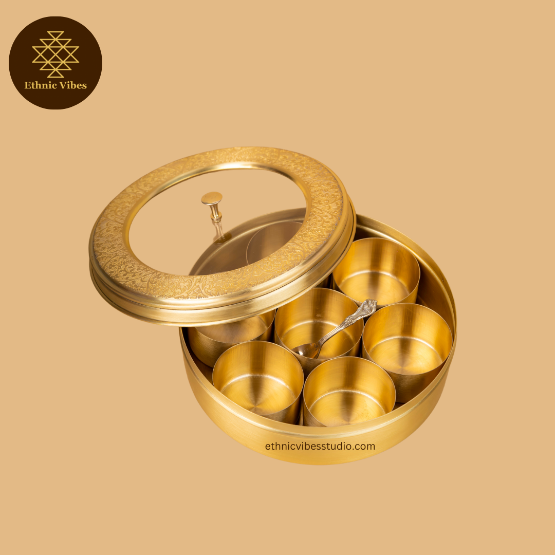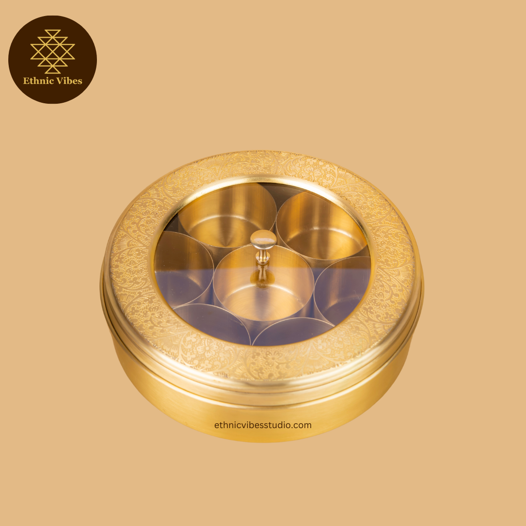 Keep your spices fresh and visible with this Transparent Brass Masala Box, crafted to blend function with style. Its clear design allows you to easily locate your spices, while the sturdy build ensures lasting freshness. Ideal for organised kitchens, it adds a contemporary touch to your cooking essentials.